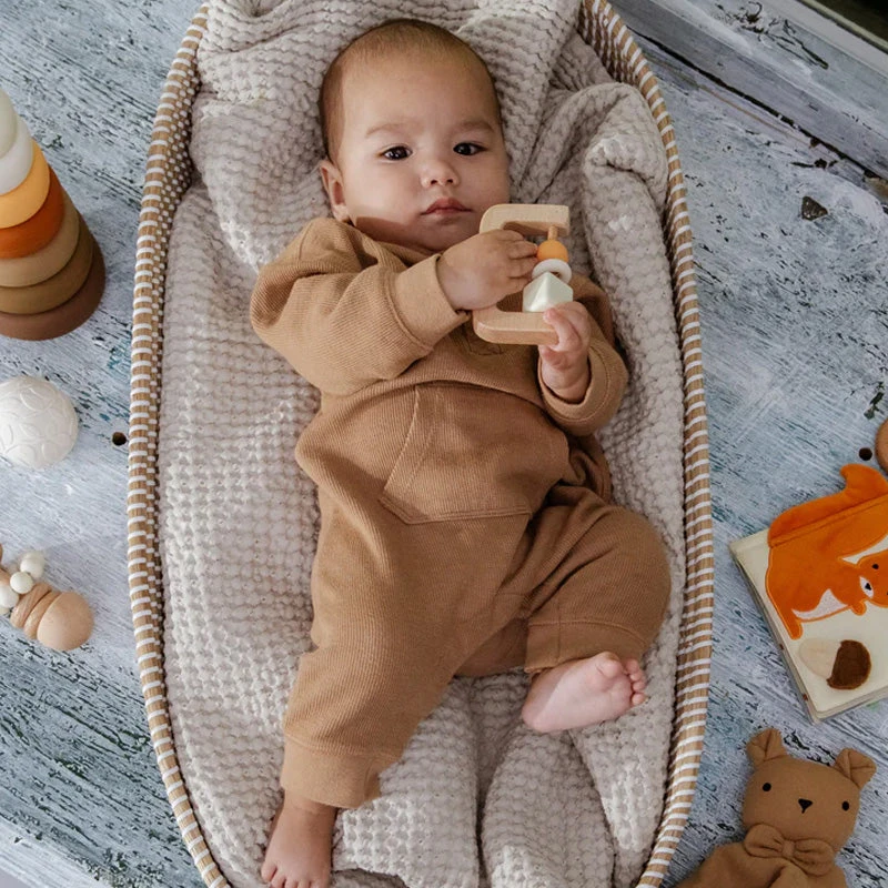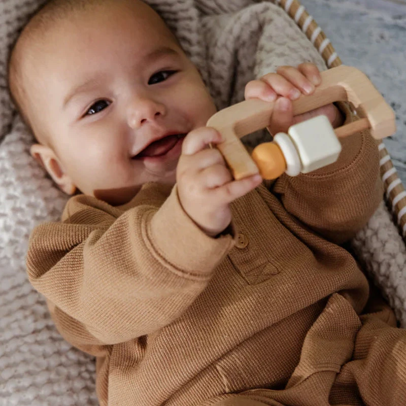 Wooden Rattle: Crafted from smooth, natural wood, this rattle is perfect for little hands to grasp and shake, promoting fine motor skills and auditory development.