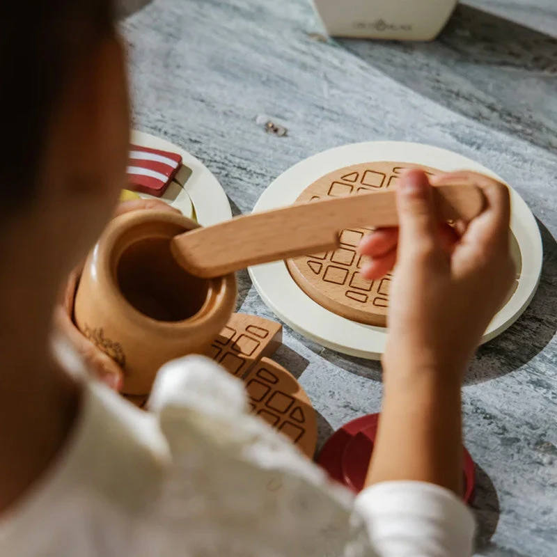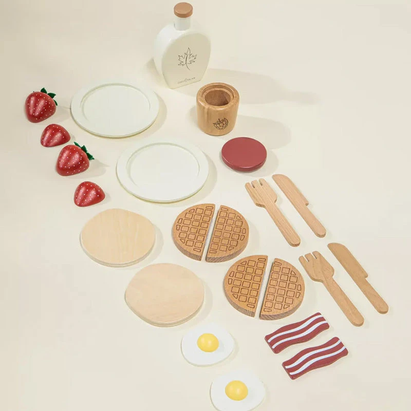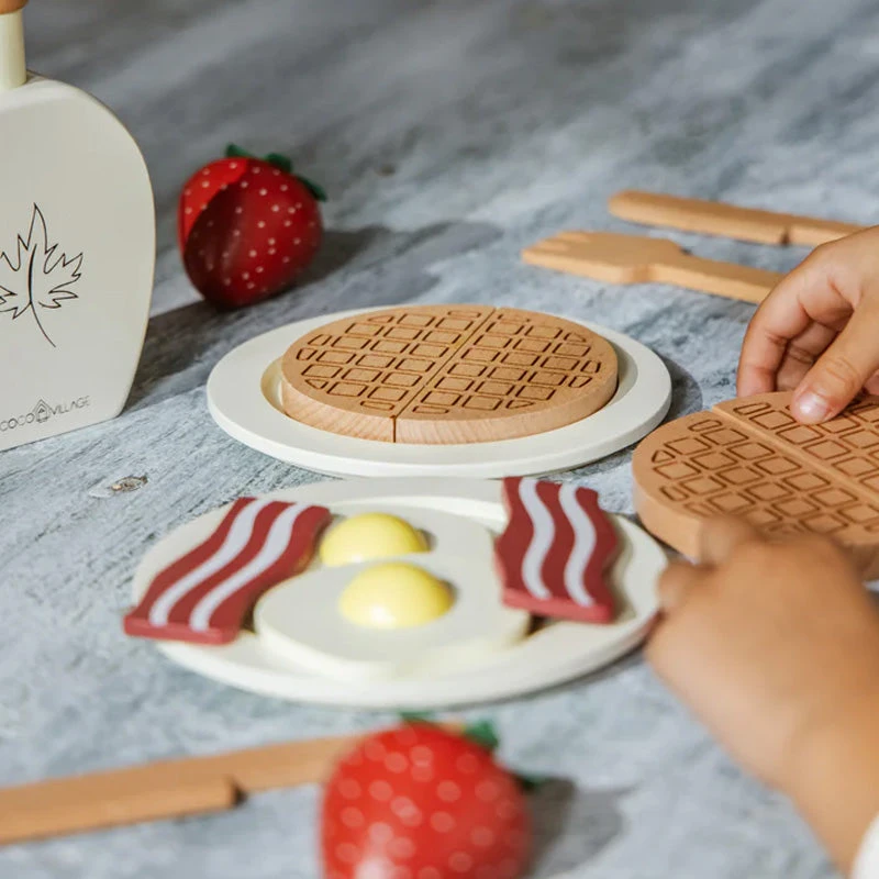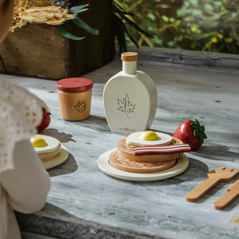 Breakfast? Lunch? Breakfast in bed? Brunch! The possiblities are endless with our Wooden Brunch Playset. Your little chefs can whip up some eggs, pancakes, waffles, bacon, jam, and of course, maple syrup! Perfect on it’s own or combined with our pretend play modules like the Wooden Coffee Shop Playset or the Wooden toaster (sold seperately)
