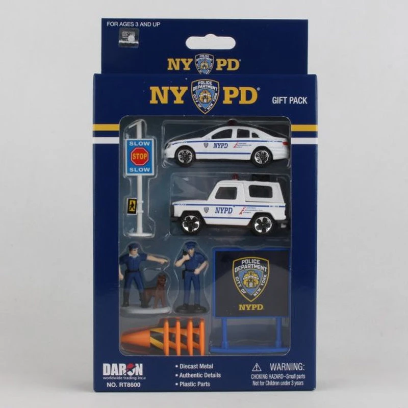 This ten-piece gift pack contains two die cast metal police vehicles, two figures, four cones, call box, and an NYPD sign. Ages 3+