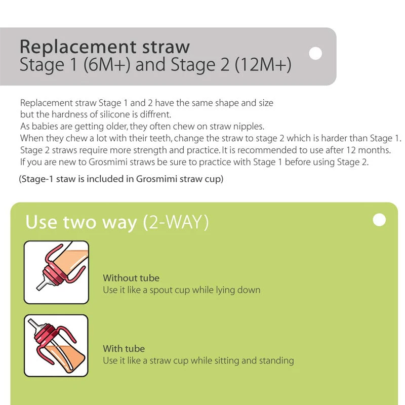 - 2 counts of stage 2 replacement straws for any Grosmimi cups and bottles. Straw brush is also included.
