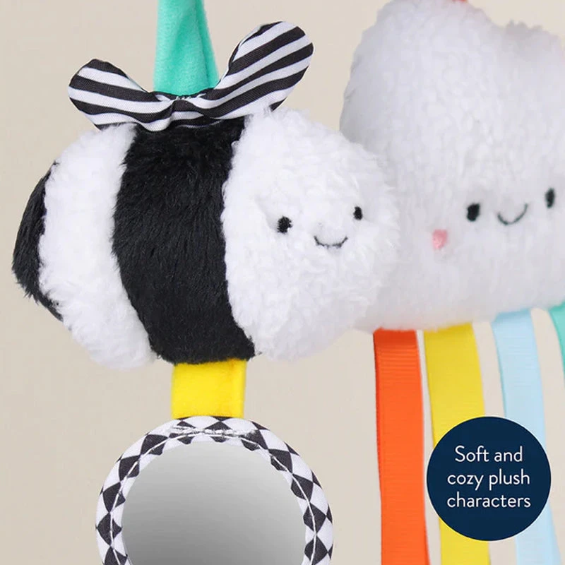 • Dangling clinking rings and cloud toy entertain baby with movement, textures and sound