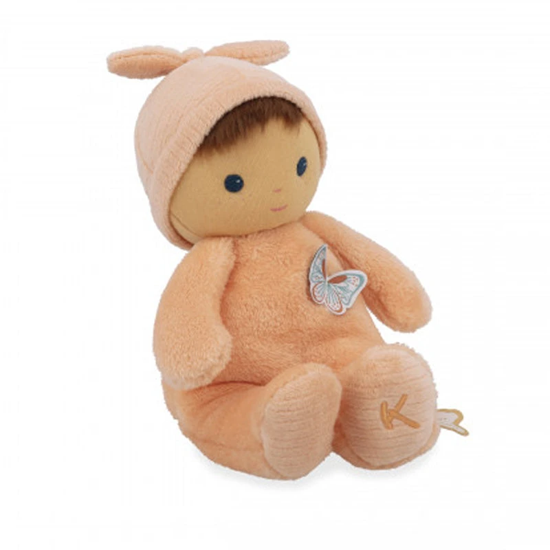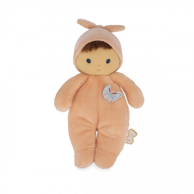 Offer Baby Zinnia, a charming and soft fabric doll, ideal as a cuddly toy or first doll for little ones. This delicate 24 cm brown doll is distinguished by its peach-colored body and bright blue eyes. Made of soft micro-velvet, corduroy, and padded with recycled polyester, this fabric doll offers a soft texture that invites the best cuddles. Inspired by the vibrant zinnia flower, it is the perfect gift to express love and strengthen the bonds of friendship. The zinnia flower is valued for its ability to thrive and bloom in a variety of conditions, making this doll a symbol of resilience and emotional fulfillment between the child and their loved ones. The torso of this little doll is decorated with a delicate butterfly, recalling the lightness and grace of flowers: an enchanting detail that will captivate all hearts. The butterfly-shaped label is a fun invitation to develop baby’s dexterity and sensory curiosity. Each interaction with Baby Zinnia gently stimulates the senses and encourages the tactile development of young children. Her adorable knotted hat is one more element to explore. Made with 90% recycled materials, this first baby doll illustrates our commitment to reducing our environmental impact while ensuring uncompromising quality and safety. Machine washable at 30°, Baby Zinnia is designed to withstand daily adventures and remain a faithful companion from baby’s birth and beyond. Baby Zinnia is not just a little soft toy, it is a first friend, a keeper of childhood memories and a symbol of the tenderness that you can offer to baby. This pink comforter is a birth gift full of love and sweetness, which promises to become the cherished companion of little ones for years to come.