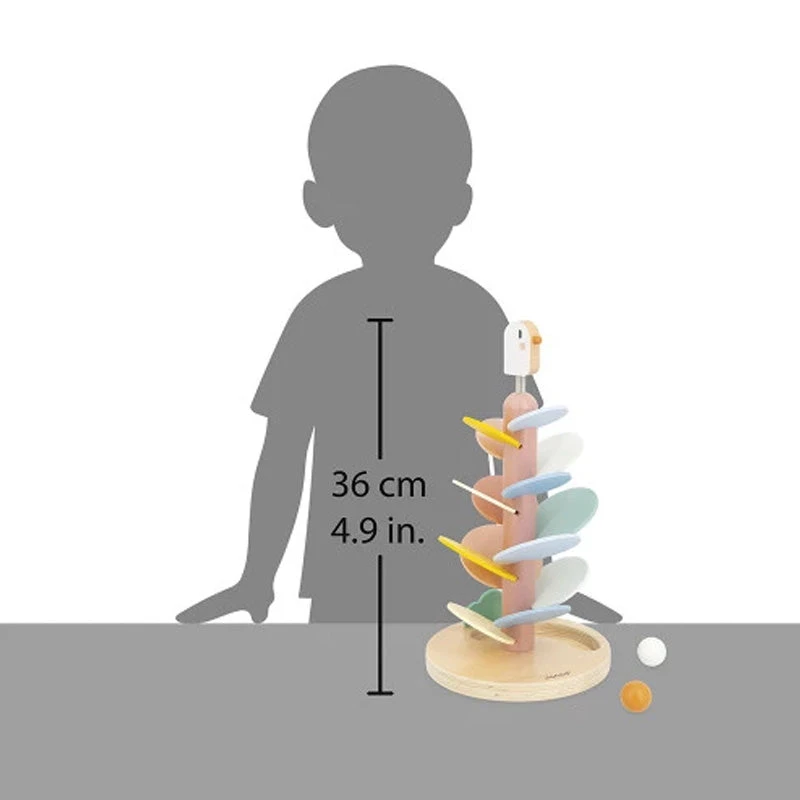 A maxi descender to chew on! Ideal for children aged 3 and over, this adorable bird descender is both a construction game and a gentle sound game. It’s designed to develop children’s fine motor skills and their understanding of cause and effect. To begin with, the base is assembled by an adult: it’s the trunk of a tree, on which a spring-loaded bird nestles nicely. Next, the little ones use the included model card to insert the tree’s leaves. There are 14 different colors and sizes. Once the beautiful tree is assembled, it’s time for the long-awaited descent! 2 wooden balls are included with the toy: let them roll down the leaves to discover a cascade of soft, repetitive sounds. One after the other, or both at the same time, the balls are so satisfying to watch as they descend! At the finish line, they end up in the notch in the base of the stand. An educational, poetic and gentle game! The soft colors, felt and natural wood give this 36 cm-high descender its charm. With its 19.3 cm diameter, it’s a beautiful decorative object for a child’s bedroom. Part of our Sweet Cocoon collection, this large descender is made of wood from sustainably managed forests, FSCâ„¢ certified. So go for it!