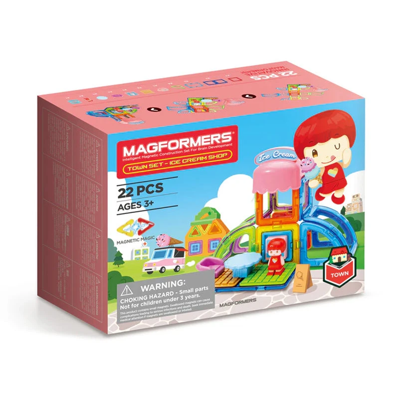 The original and authentic Magformers. Set includes 22 Pieces. 7 Squares, 2 Arches, 4 Sectors, 1 Rectangle, 1 Ice Cream Sign, 2 base plates, 1 Ice Cream block, 1 Mini Chair, 1 Mini Table, 1 Ice Cream Seller and 1 Wall Plate.