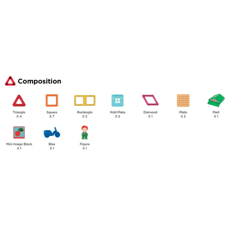 The original and authentic Magformers. Set includes 22 Pieces. 7 Squares, 4 Triangles, 2 Rectangles, 1 Rhombus, 1 Mart Sign, 2 base plates, 1 Vegetable block, 1 Mini Bike, 1 Grocer, and 2 Wall Plates.