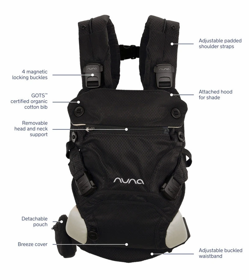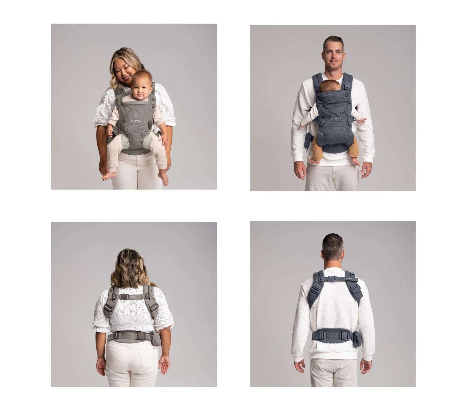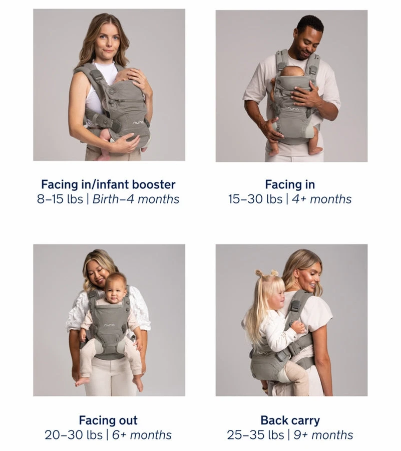 - Four carry positions provide ergonomic positioning as your child grows, for healthy spine and hip development: newborn mode, facing in, facing out, back carry.