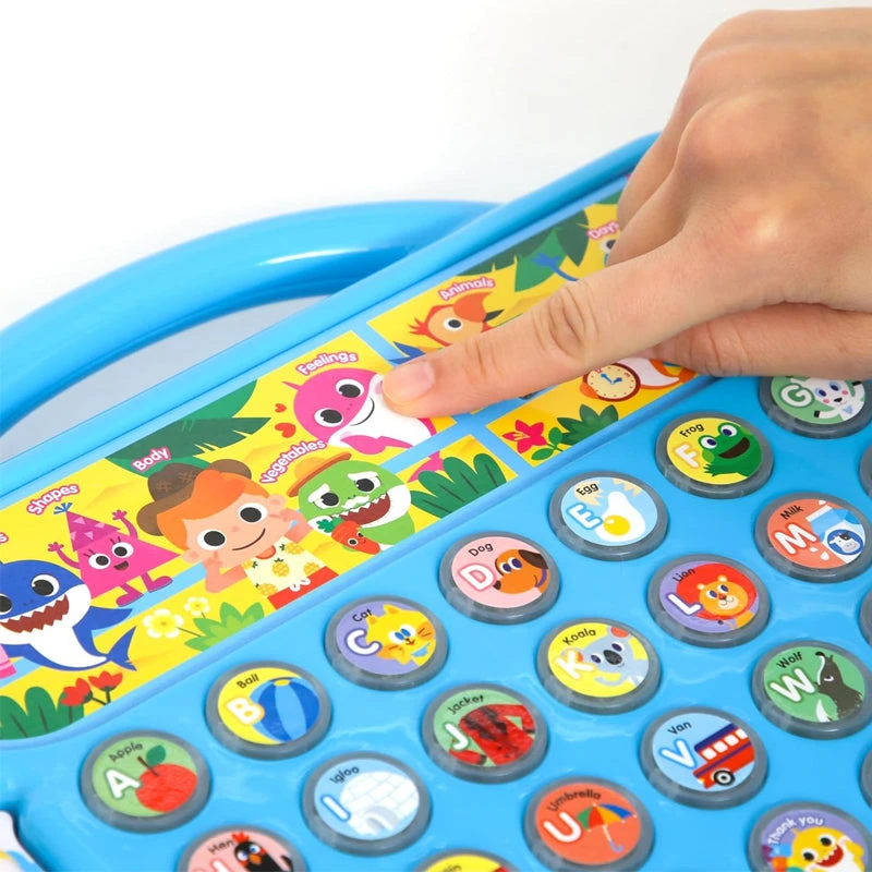 - OFFICIAL PINKFONG BABY SHARK EDUCATIONAL TOY that plays the iconic Baby Shark song (doo doo doo doo doo)! 37 circular buttons (+10 touch buttons on screen) with 6 learning modes (Letters, Words, Phonics, Quiz, Songs, and LED Light Play) in addition to 38 LED lights for a vibrant learning experience! Features a round blue take-along handle for babies to have a tactile experience as well as carry the sound toy wherever they go!