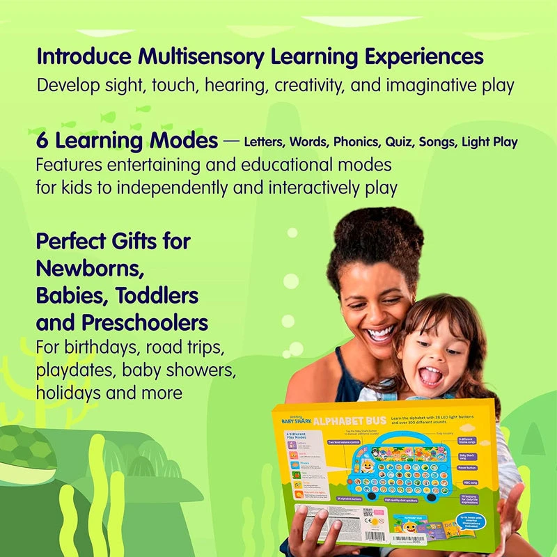 - BABY SHARK ABC LEARNING TOY that is shaped as a bus with a handle and the iconic Baby Shark as its driver! Plays 47 Pinkfong songs and over 300 sounds, including a colorful lyrics booklet for an engaging, early abc learning for toddlers. Content-heavy blue school bus toy to enjoy songs for each alphabet, play with LED lights, intuitive learning with quiz time, and many more!
