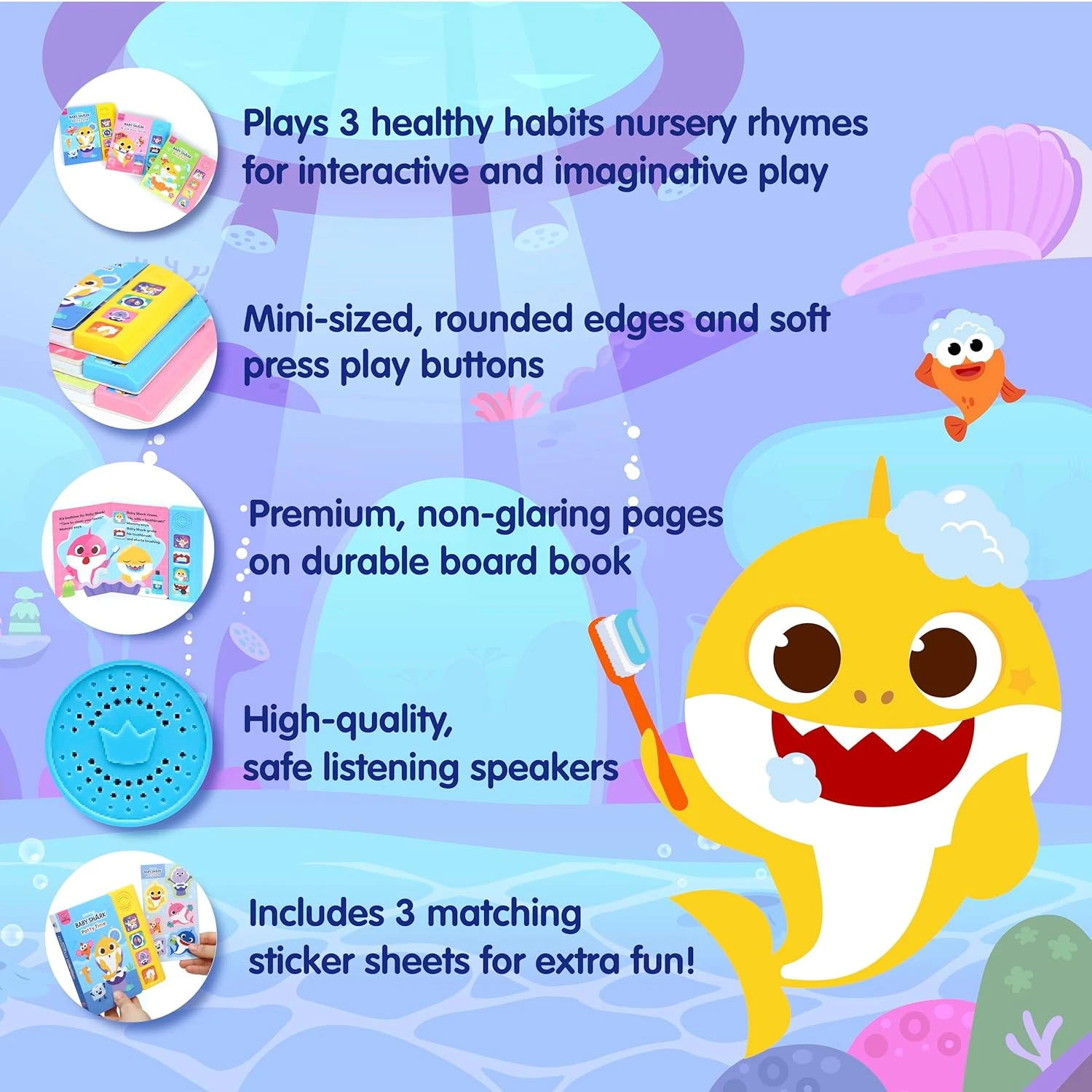 - Baby Shark collection of healthy routines, designed to educate children about maintaining healthy daily routines. This fun-filled set is designed to educate kids on essential habits, such as using the potty, brushing teeth, and taking a bath. With easy-to-follow steps, kids can read, sing along, and repeat alongside Baby Shark and the Shark family, making the learning experience enjoyable and interactive!