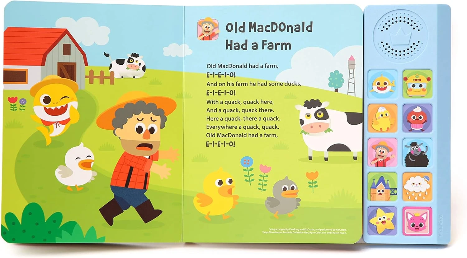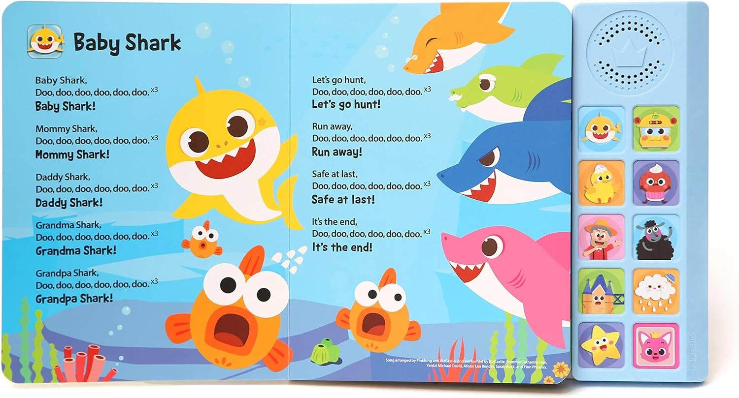 - OFFICIAL PINKFONG BABY SHARK BOOK that plays the iconic Baby Shark song (doo doo doo doo doo)! Our premium 10 button sound book that features 10 press-play buttons, 9 full singing songs (+ bonus Pinkfong stinger sound), and 16 colorfully illustrated pages with lyrics on non-glaring, highly durable pages.