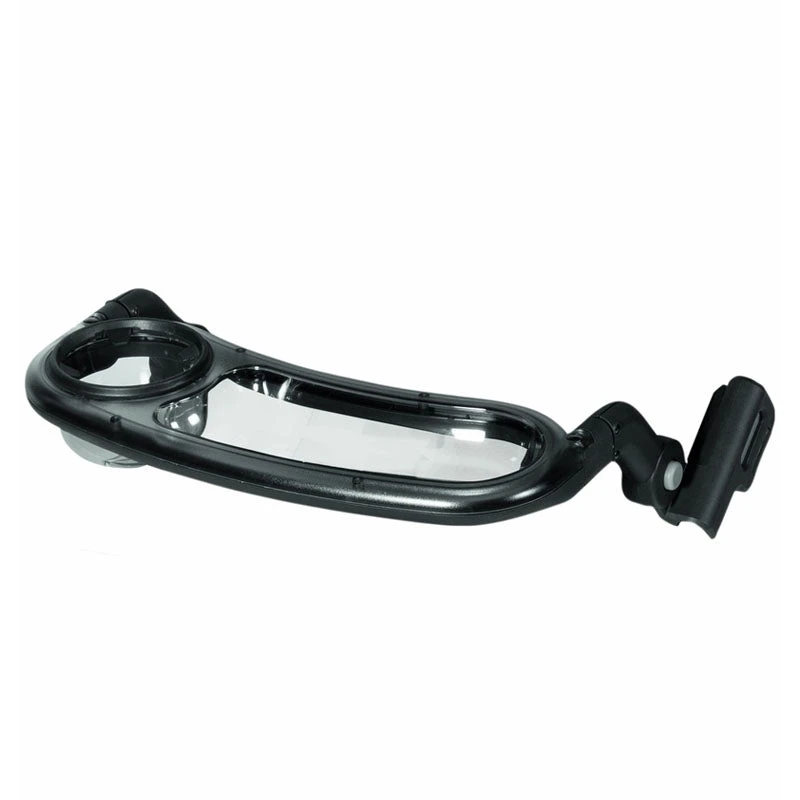 - Pivots down to remain attached while folding with stroller.